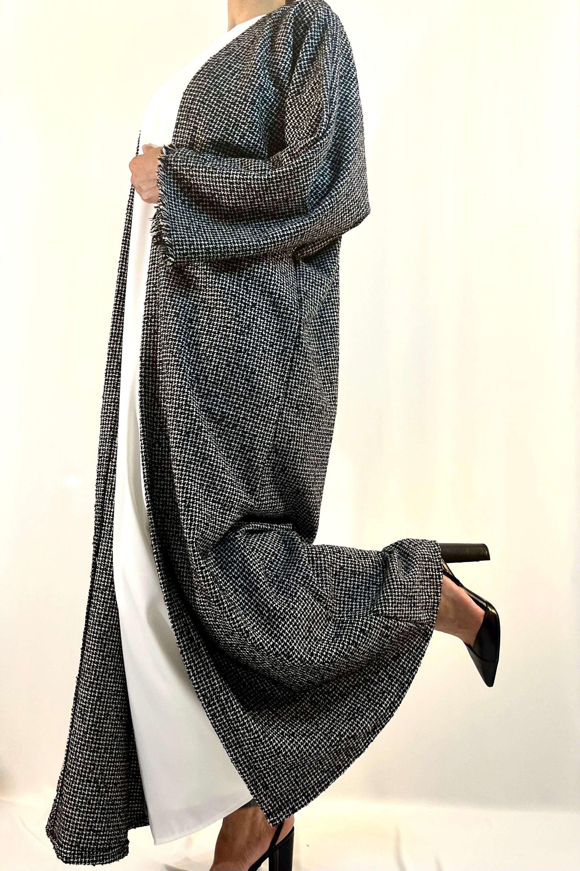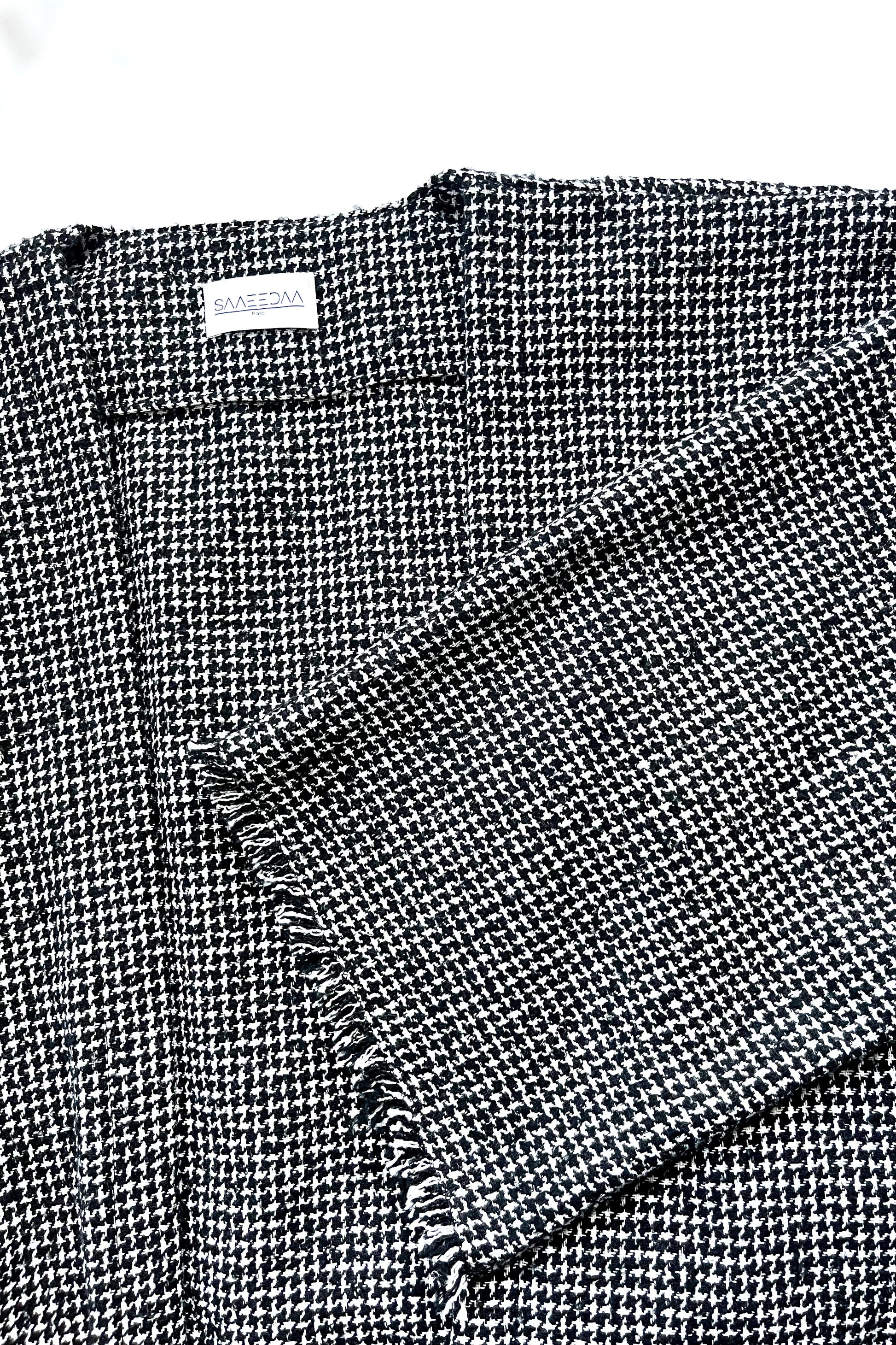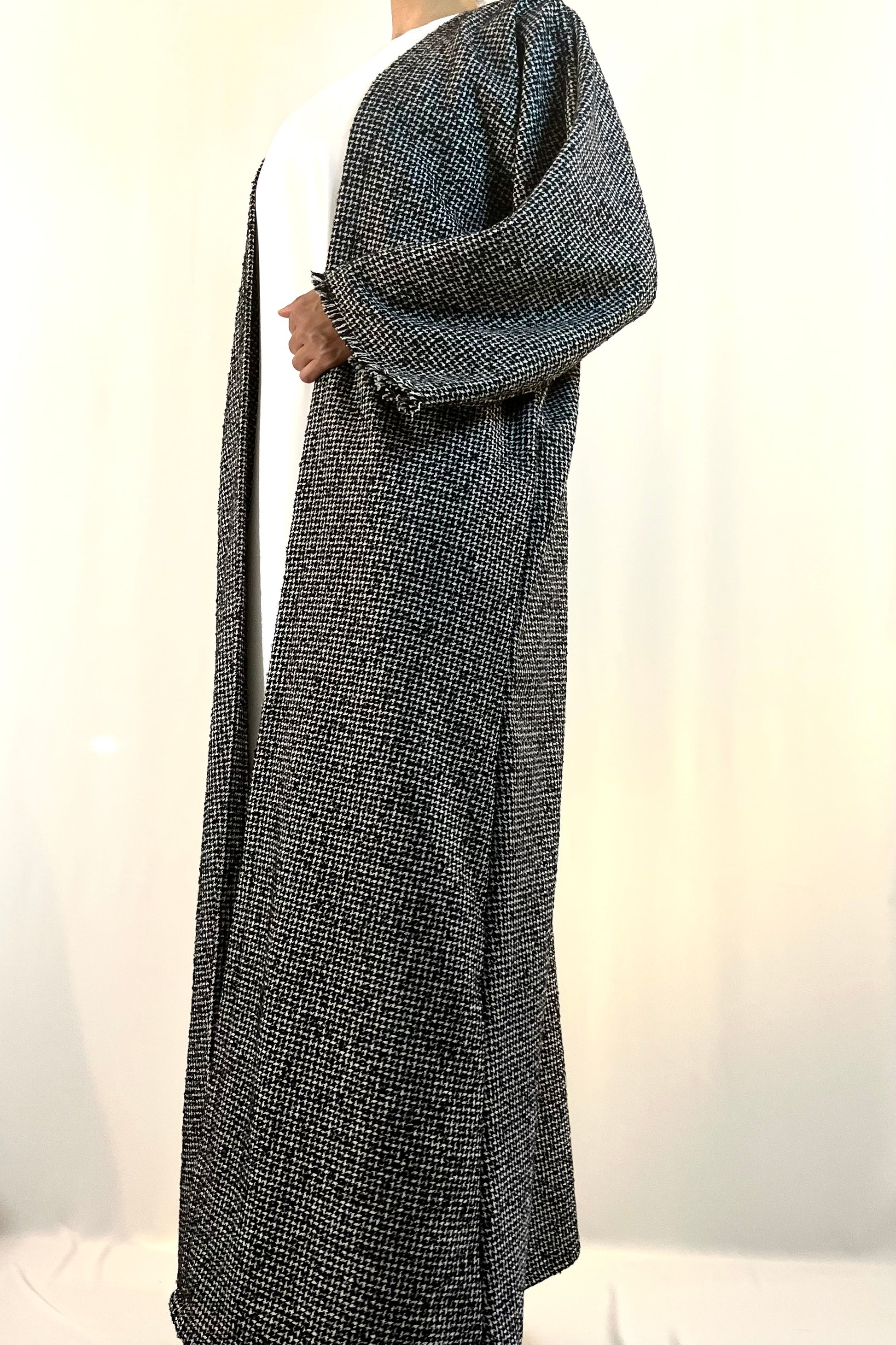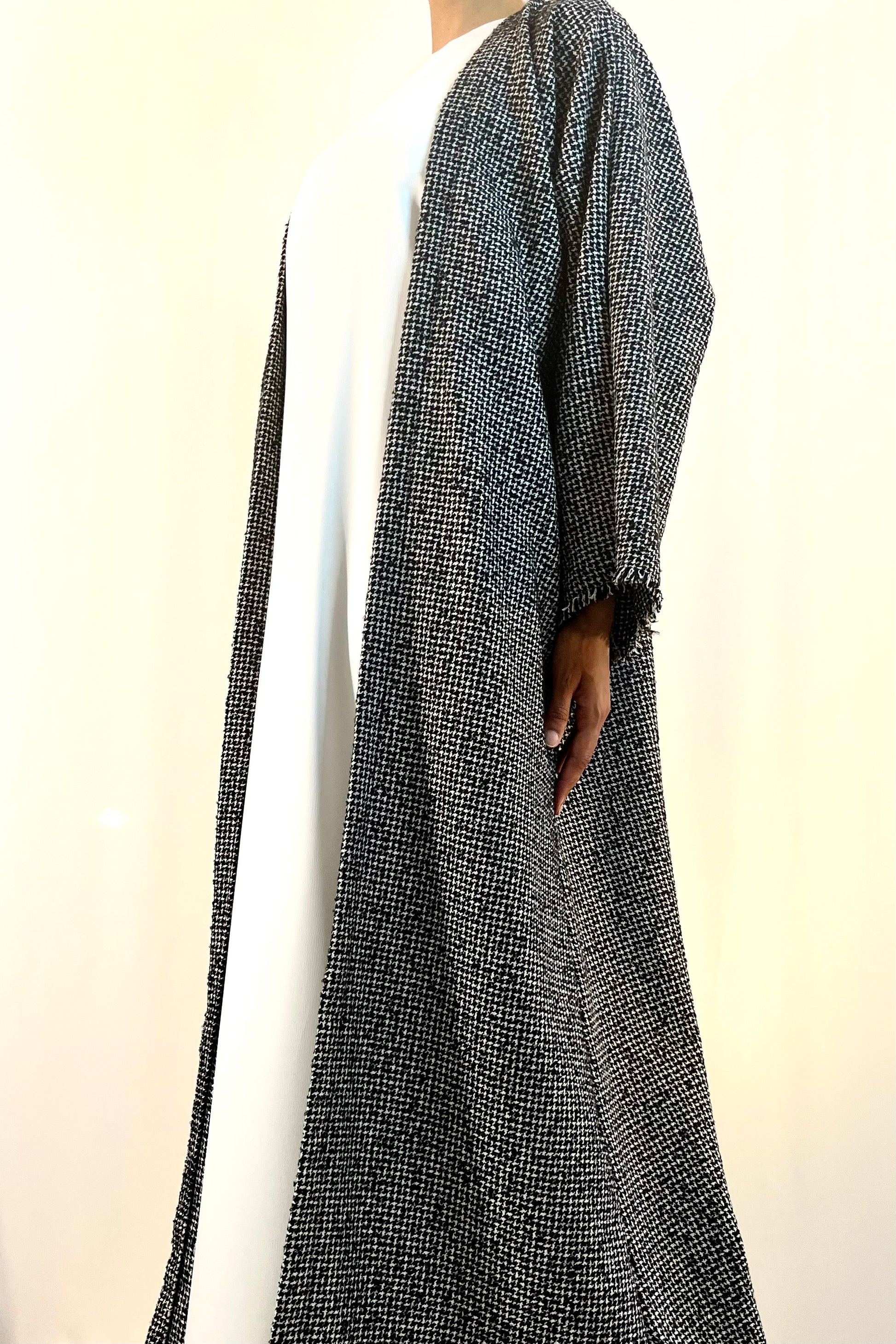 Kimono noir et blanc avec un motif texturé raffiné. Confectionné dans un tissu de haute qualité, cet élégant kimono offre à la fois structure et confort, idéal pour les saisons plus fraîches.